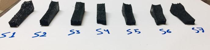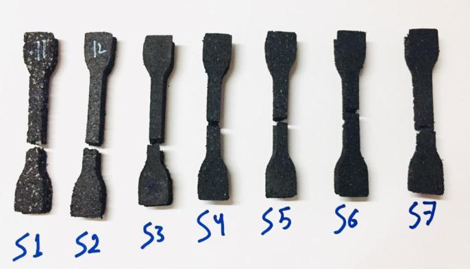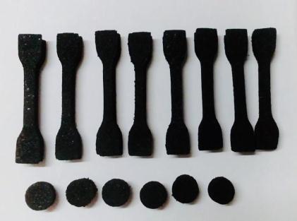 AlltestswereconductedattheNationalResearchCenter inEgypt,documentedwithofficialpapers,andstampedwith thesealoftheaccreditedcenter.GALDABINI QUASAR600 testingmachinewasusedto carryout thetensiletestat a testspeedof50mm/min.Picturesweretakenofallsamples during steps of pressing and testing, and 5 samples were analyzed for each mixture. Figure 6 shows some of the samplesaftercutting.