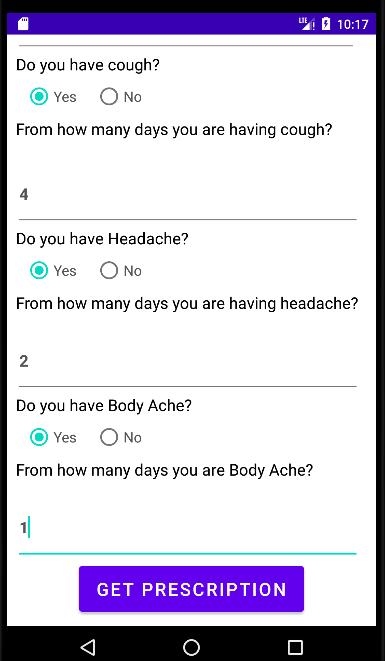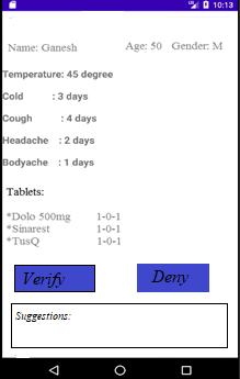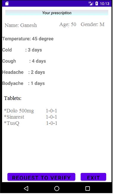 Check up Module: In this module, the user is asked about his medical details like temperature, symptoms (cold, cough, headache, body pain, vomiting, and dizziness) along with number of days of having symptoms. According to theseinputs,theprescriptionisgeneratedbythesystem.