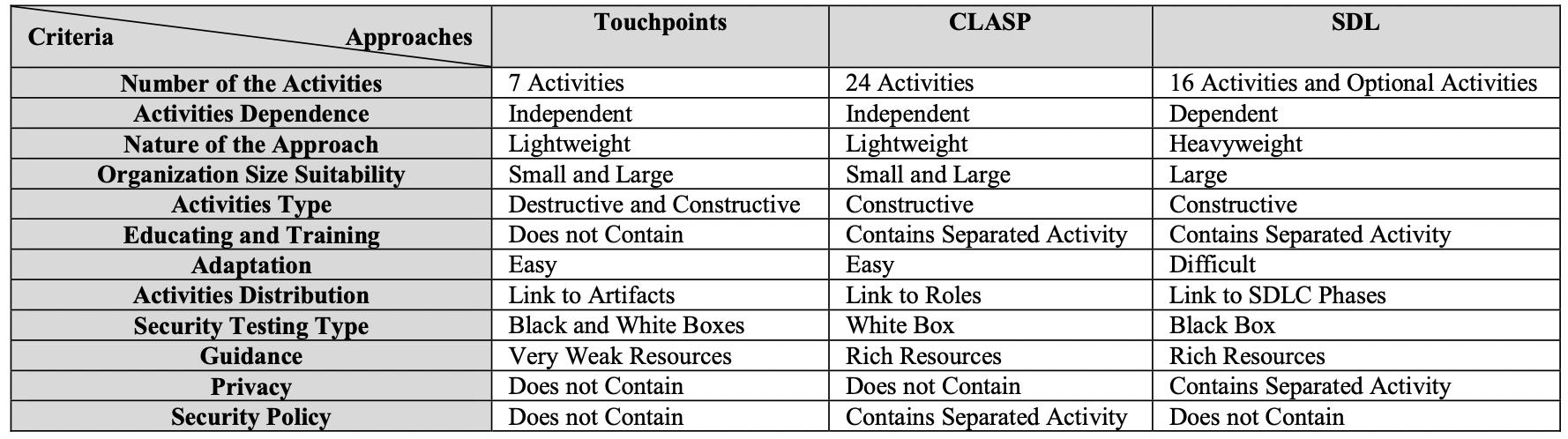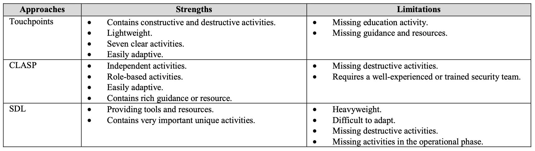 Abstract - Most firms have a well oiled machine in place for developing, delivering, and maintaining functional software. However, when it comes to safeguarding that programme, not so much. Many development teams still see security as an impediment, something that creates roadblocks and compels them to redo work, preventing them from bringing innovative new things to market. However, unsecure software puts firms at risk. Cool new features will not protect you or your consumers if your product contains exploitable flaws that hackers can exploit. Instead, your team must incorporate security across the software development life cycle (SDLC) so that it facilitates, rather than hinders, the delivery of high quality, highly secure products to market. The aim of this paper is to evaluate these three security approaches by discussing their common process, strength, and limitations. Moreover, we discuss why these approaches do not effectively increase software security, and then we set the stage for a future framework to enhance and simplify the application of various security activities within the SDLC. The structure of this paper is as follows. First, briefly describing the Touchpoints, CLASP, and SDL approaches respectively, then the comparison between the three approaches based on a set of criteria. Followed by critical evaluation of the three approaches, I discuss activities that are shared among the approaches, then I illustrate the strength and the weakness for each one, comparing more models at the end.