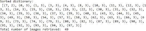 After filtering photos containing only components in the query, they must be ranked according to relevance. Relevance, here is a measure that counts the number of query objects found in the photos counting different instances (objects) of the same class as 1. Based on the numberofqueryobjects,givenintheinputsketch,foundin each of the photos, they are given a rank. Rank=1 is given to photos containing all query objects, rank=2 is given to photosmissingat most1queryobjectandrank=3isgiven forallotherimages.NOTE:Imagesthatdonotcontainany ofthequeryobjectsarediscardedintheretrieval process. The tuple in the sorted dictionary contains images in the rankedorder.Consideratuplefromthedictionary(7,2)in Fig.18.Here7isthephotonumberand2istherank.