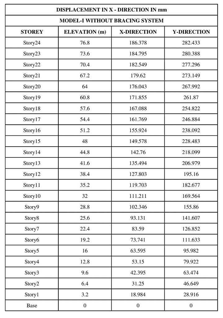 It is seen that the maximum storey displacement 186.378 mmin X directionand282.433mmin Ydirectionat 24th storey top of the structure in the Model I without bracing system.