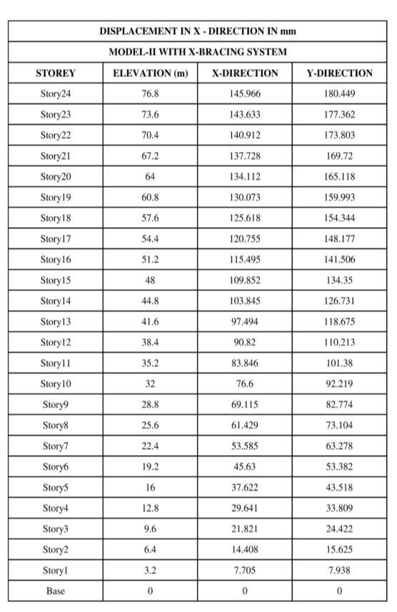 It is seen that the maximum storey displacement 145.966 mmin X directionand180.449mmin Ydirectionat 24th storeyofthestructureandascomparingbothdirectionin whichinydirection,thedisplacementisfoundmaximumin Model IIinwhichthebuildingwithcross(X)bracingsystem.