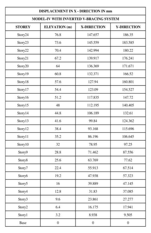 It is seen that the maximum storey displacement 147.657 mminXdirectionand186.350mminYdirectionattopof thestructureinmodel IVwithinvertedVbracingsystem.