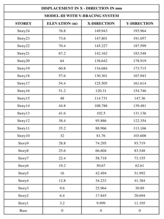 Itisfoundthatthemaximumstoreydisplacement149.943 mminXdirectionand193.964mminYdirectionattopof thestructureinModel IIIwithVbracingsystem.