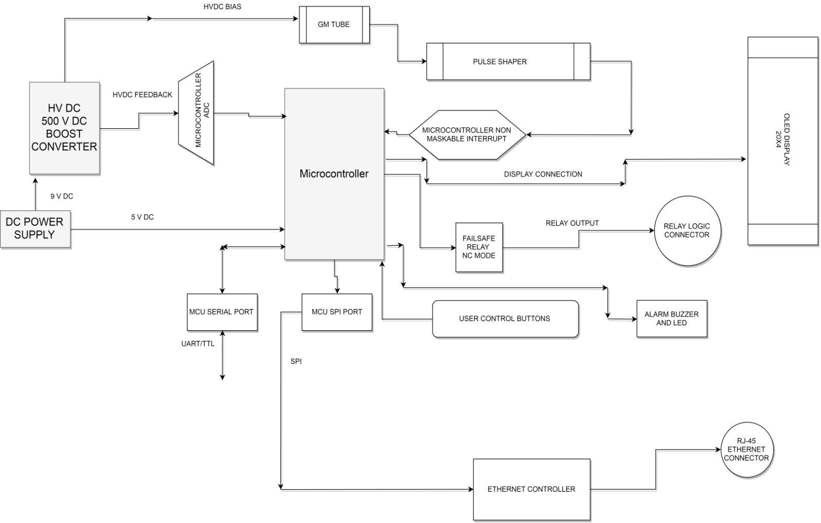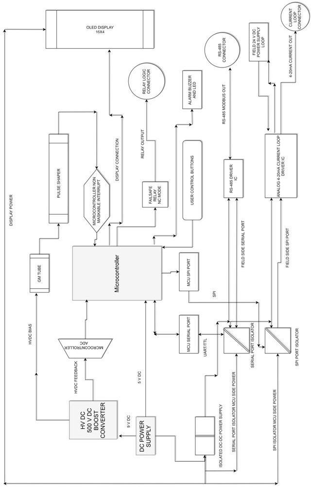 TheGMTubeusedisLND7121thatworksfromarangeof450Vto600VhighvoltageDC(HVDC).TheHVDCcircuithasbeen constructedusinga boostconverterthatconverts9VDCto500VDCandisalowrippleDCVoltage [1].Whenradiationis incidentonGMtubeandinsidethepulseoutputcanbeseenin Fig. 4.ThepulsesareprocessedandconvertedintoLogiclevel compatiblepulsesusingpulseshapercircuitasin Fig. 4,sothatitcanbereadbyMicrocontrollerbasedCounterassemblyas CPMorCPS,aswellasdeadtimecompensationforGMtubeisdone [3] Thedeadtimeisthetimeduringwhich,afterthe detectionofanevent,theGMcountercannotdetectasubsequentevent.TheMicrocontrollercontainscalibrationdatathat convertstherespectivecountsintermsofmR/hrorµSv/hr.ThereisusersetAlarmradiationthresholdinthesystem,andif theincidentradiationcrossesthislimittheLogicrelayisactivatedforsafetyinterlockingaswellastheAlarmLEDstartsto blinkandAlarmbuzzerstartstosound.TheentiredatacanbeseenonInstrumentlocaldisplaythatconsistsofaveryhigh contrastOLEDdisplayscreenasseeninFigure7.Averyreliable4 20mAcurrentloopmodulehasbeenimplementedforthe instrumentwhichisveryusefulforgatheringinstrumentparametervaluetoacentralizedPLCbasedsystemwithAnalogInput moduleswhichwouldhelptogatherallthePlantRadiationdataontoasinglesystemanddisplayonSCADA.Theinstrument alsoincludesRS 485basedserialcommunicationmodulethatisessentialforIndustrialdigitalserialcommunication.However thesemodulesareoptionalandmaybeimplementedasperuser'schoice.Operationsflowcharthasbeendepictedin Fig. 5 Furthertherewasdevelopment of AreaGammaMonitorwithEthernetcommunicationinterfacetoimplementMODBUSTCP andTCP/IPwhichgivethisinstrumentaversatilityofmountingthesameinindustryaswellasinCivilianarea.Itdenotes RadiationdoserateintermsofeithermR/hrorµSv/hrandgenerateslocalsoundandlightbasedalarmifradiationdoserateis highbeyondpermissiblelimitsforvariouszonessetasthreshold.ItalsocommunicatestheRadiationdoseratedataandother instrumentparametersthrough TCP/IP Ethernet.ThisparticularcommunicationprotocolwaschosenasthereisEthernet connectivityalmostanywherenowadays,namely,offices,ports,labsetc.Propersignalisolationhasbeenimplementedinboth theinstrumentsmodelsforreliableoperationinindustrialenvironment.