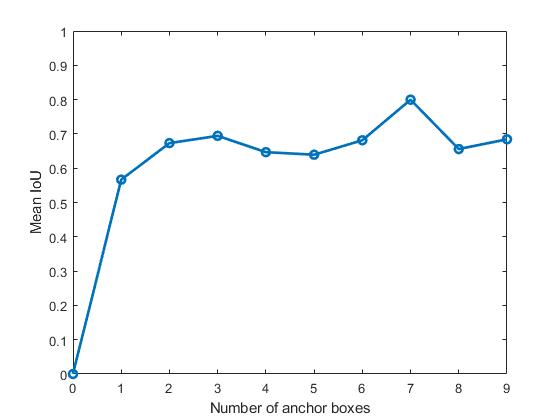 The trade off to consider when deciding on the number of anchor boxes to Using a big IoU guarantees that the anchor boxes overlap effectively with the training data's bounding boxes. but utilizing more anchor boxes increases the computationalcostandincreasestheriskofoverfitting.Threeanchorboxesarechosenafterreviewingtheplot,andtheir sizes are generated from the output of the estimate Anchor Boxes function, with a width scaling ratio of 0.8 utilized to matchtheinputlayer'sshrinkagefrom320to256pixels.
