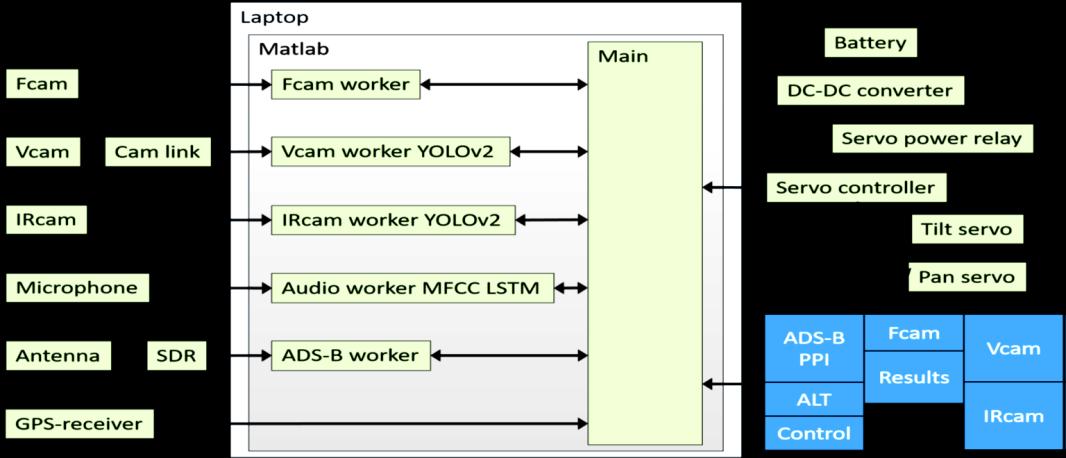 The system uses the principal electro optical sensors for detection and classification, a thermal infrared camera and a videocamera ThetechnologymakesADS Bdata availableinordertokeeptrack ofcooperativeaircraft1inthe airspace. Whenadroneorahelicopterentersthesystem'sarea ofoperation, audiodataisusedtodeterminetheirpresenceusing their different noises. The system's computations are performed on an ordinary laptop. This is also where the user sees the detection results. The following is the system architecture, which includes the main layout of the graphical user interface(GUI):