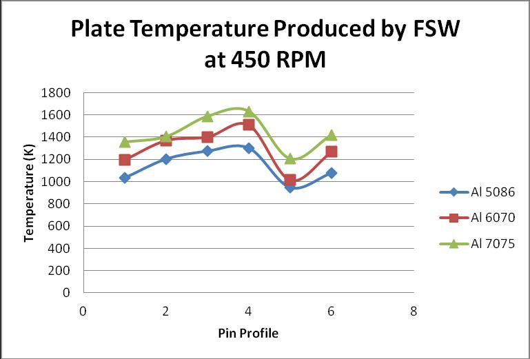 Temperatureproducedatthesurfaceofthealuminumsheet due to joining the two aluminum plates with help of the frictionstirweldingisknownasplatetemperature.When therotationalspeedofofthepinprofileiskeptat450RPM, thetemperaturegeneratedatthesurfaceofthealuminum plateisgiveninthegraph 01: