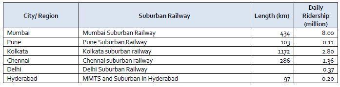 Metropolitanstructureandland useassumesasignificant partintheridershipofruralrailframework.Thisoutcomes in variety in use of rural rail routes across various urban communities. Every day ridership on rural rail route framework in Mumbai, Pune, Kolkata, Chennai, Delhi and Hyderabad.