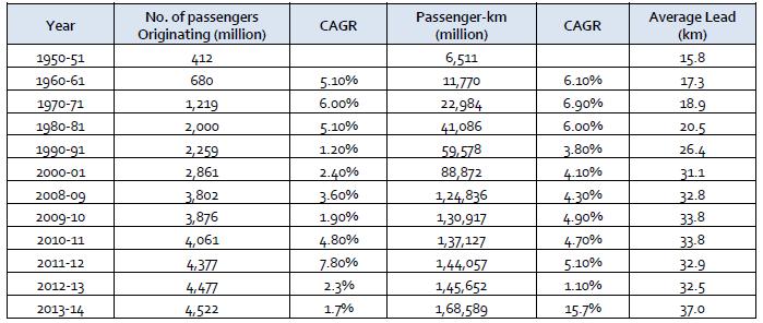 In1950 51,thequantityoftravellersbenefitingofruralrail activities was 412 million, which developed in excess of eleven overlap to 4,552 million by 2013 14. As far as traveller km, be that as it may, it developed from 6,511 million of every 1950 51 to 1,68,589 million by 2013 14, whichismultipletimesincrementoveratimeofsixtyyears. Throughout a similar time, normal lead length multiplied from15.8kmto37.0km,becauseofthedevelopmentofthe urban communities. Interest for rural traveller travel in India has been developing at a yearly pace of 3.6% somewhereintherangeof2001and2014.Somewherein therangeof2011and2012thedevelopmentrateincreased byto7.8%andfurtherdiminishedto1.7%in2013 14.Asfar astravellerkm,theinteresthasshownadevelopmentpace of5.0%somewhereintherangeof2001and2014.