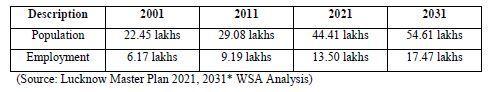Withits2.2million(COI,2001Estimates)residents Lucknowhascurrentlyover3millionpopulationin urbanareas.Themasterplanhasenvisagedthata populationofabout3.2millionand4.0millionby years2011&2021respectively.