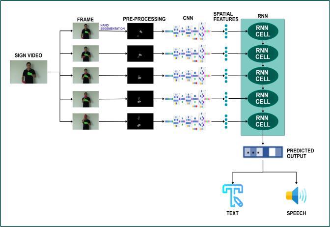 CNN model we trained will be given all the frames of the video, the CNN model will output the spatial features which are in the form array. The arrays will then be padded to 200 arrays if the video is short. All the arrays willbegiventotheLSTMmodel.Bytakingspatialfeatures and by doing the temporal analysis of those frames, the LSTMmodelwillpredictthesigngiveninthegivenvideo. The resulted output from LSTM will be converted to text andspeechwillbepresentedtotheuser.