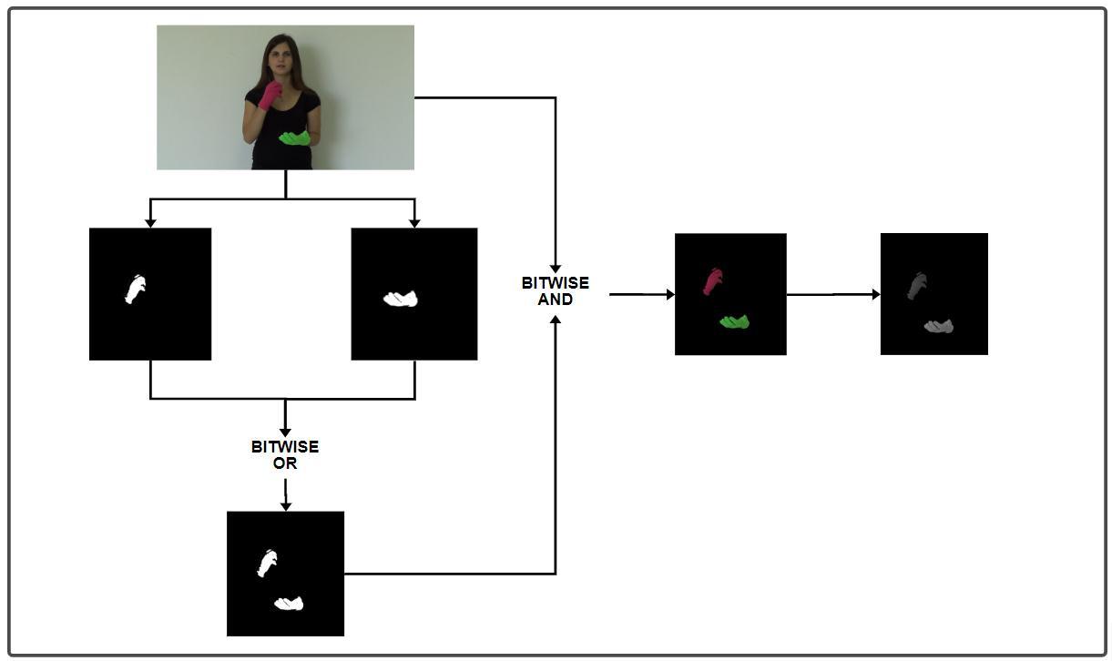 The Frame ‘F’ from the video is taken and Both colours from the hands will get extracted separately, say H1 and H2. Both H1 and H2 will be merged by doing Bitwise OR operation after which we get F2., which then will be multiplied with the original image F to get a coloured image of hands (COL_FRAME) and then be converted to grayscaleimage(GRAY_IMG) F=>H1 F=>H2 (H1+H2)=>F2 (F2ANDF)=> COL_FRAME COL_FRAME=>GRAY_IMG