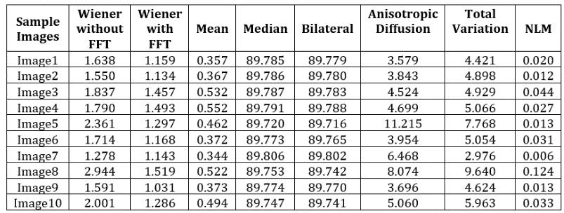 We compared the suggested method to different preprocessingmethodsinordertovalidateit.Byemploying multiple filtering approaches, the preprocessing technique used in this study effort reduces unnecessary noise and improvestheimagequality.Thisstudyemploysavarietyof imagefilteringalgorithms,includingWiener,Mean,Median, Bilateral,AnisotropicDiffusion,Non LocalMeansandTotal Variation. The findings are studied and compared to a standardnoisepattern,aswellasratedintermsofquality. The goal of this study is to focus on selecting the proper