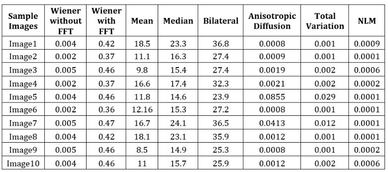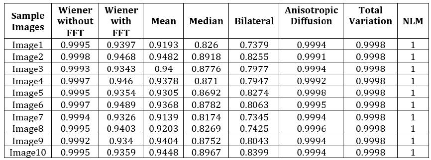 Theperformanceofseveraldenoisingfiltersiscompared inChart1,anditisobviousfromthegraphplotthatthe NLMfilteroutperformsallothers.