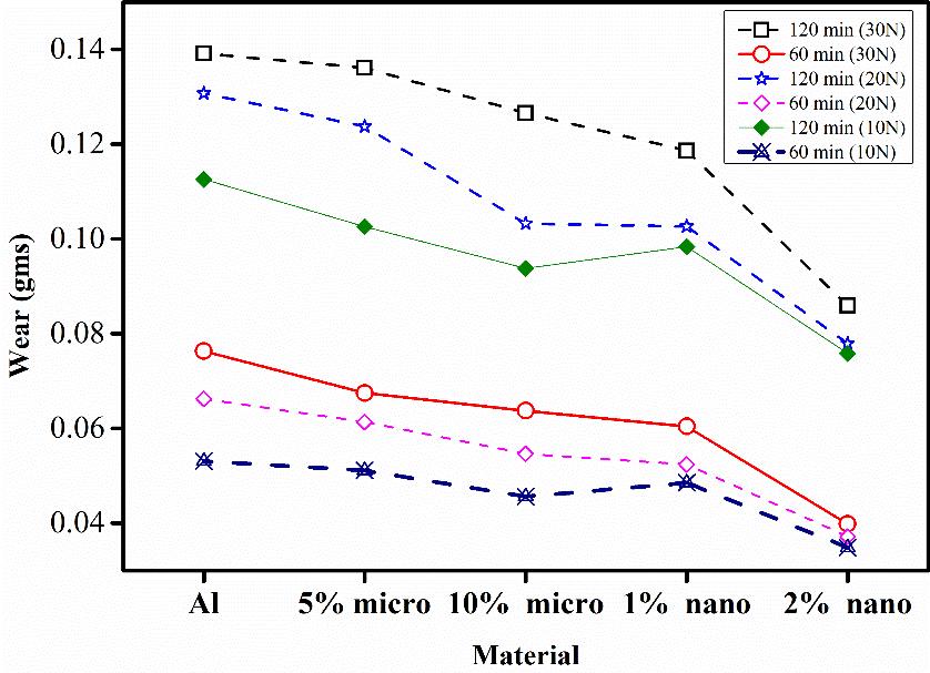 Pin on diskweartestofSiCnanoparticles(SiCn)usedinA356alloyshowedafour foldreductioninmateriallosscompared tothebasealloyatthehighestloadof9kgusedduringexperimentsconductedat2.5m/s.Thebehavioroffrictioncoefficient withincreaseddistanceandloadshowedanearconstantandreducedvaluewithincreasedfractionofSiCn[13].Comparisonof wearbehaviorbetweenmicroandnanocompositeofSiCreinforcementsaddedtoanAlmatrixcomprisingofhighmagnesium content and low concentration of Fe Zn Si showed no significant effect of applied load on wear behavior of 2% SiCn nanocomposite(Fig.1).Significantreductionofover38%isseenfromthedataonmateriallossforthe2%SiCncomparedto thebasealloy. Animprovementofover36%inwearresistancewasobtainedat120min,30Nforthe2%SiCncomparedtothe 5%microSiCundersimilartestconditions,Chart 1[14].