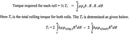 ThetorqueinrollingprocessismultiplicationofFanda.the powerisrequiredinrollingcanbegotbyassumingtheFis actatmiddleofarcofcontacttherefora=L/2