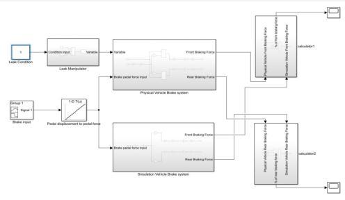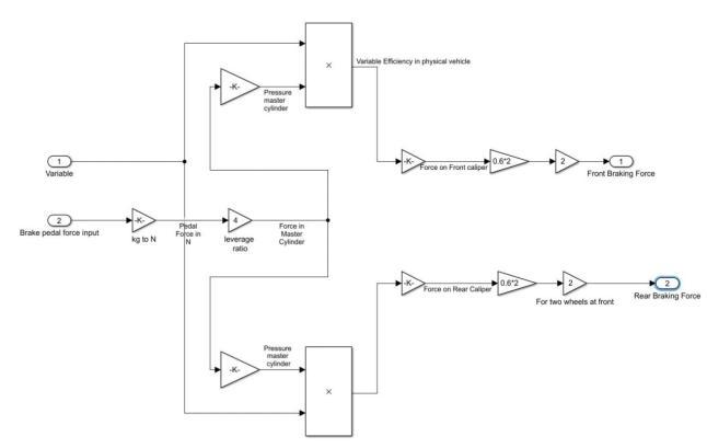 Thephysicalvehiclebrakesystem is gettingthebrakepedalforceandleak manipulationvariablefromleak manipulator sub blocks.Thebrakepedalinput forceisdriverappliedforce.Andusedgainblockstocalculatetheforceonthemaster cylinder. Thenusingproductblocktocalculatevariableefficiencyinthephysicalvehicle.Finally,thefrontwheelbraking forceandrearwheelbrakingforcearecalculated.Theblockisshownbelow(Figure.4)Physical