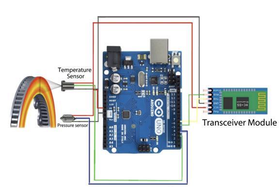 ThebrakeunitArduinoUnomicrocontrollerstoresdatafromthepressuretransducerandtheinfraredtemperaturesensor. And the stored data are compared to the reference data (it is an open loop system) and processed by Arduino Uno microcontroller.ThoseprocesseddataaretransmittingviaradiosignalsbyusingtheNRF23L01transceivermodule.