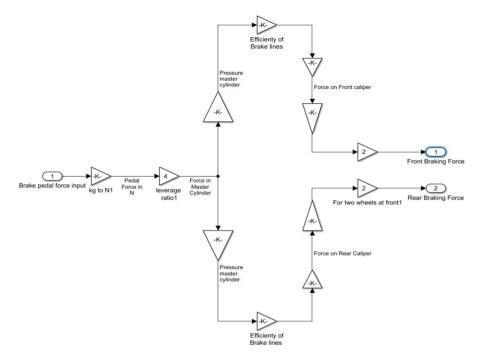 The simulation vehicle brake system is getting the brake pedal force from the bake input block and pedal displacement. The brake pedal input force is driver applied force. And used gain blocks to calculate the force on the master cylinder. Thenthefrontwheelbrakingforceandrearwheelbrakingforcearecalculated.Thereisnopressureleakinthesimulation vehiclebrakesystem.Theblockisshownbelowin(Figure.6)Simulationvehiclebrakesystemmodelblock.