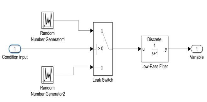 Leak manipulator is creating a pressure leak in the physical vehicle brakesystem. Thisleak manipulator is getting input from a constant block. There is a pressure leak if the value of the constant block is one, otherwise, there is no pressure leak.Andtherandomnumbergeneratorisusedinthis model.Here,thelowpassfilterisusedtoreducethenoiseinthe signal.Theblockisshownbelowin(Figure.5)Leakmanipulatormodelblock.