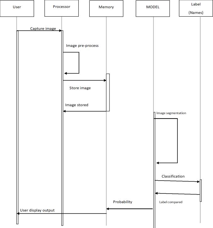 The sequence diagram consists of 5 blocks namely user, processor, memory, model, and labels respectively as shownin the Figure Theuser provides the input images via already saved information that has been captured, processing, and preprocessing of image data such as resizing,reshaping,andstoringthereminiscenceunit.