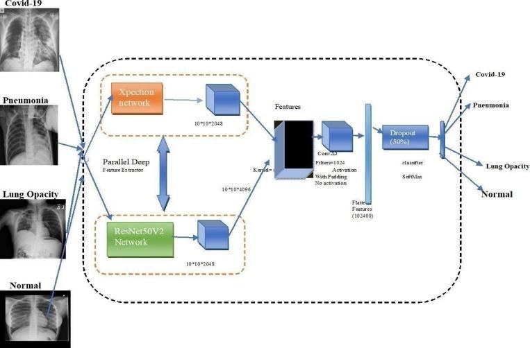 As preprocessing and loading the image in the memory unithasbeendone CNNmodelistrained,thefeatureof the image is extracted for output classification. Next, classification of the label is provided for instance usual, COVID 19,viralpneumonia,andlungopaqueness