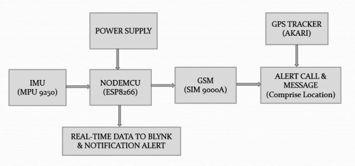 TheIMUunitwhichisMPU9250isembeddedwith the features of three individual units which are the Accelerometer,Gyroscope,andMagnetometer.Hereinthis projectwemainlyutilizetheAccelerometerandGyroscope forthecalculationofRoll,Pitch,andYawwhicharemotions ofthefishingvessel.Thatinformationisbeingevaluatedby the NodeMCU microcontroller whether there is any boat capsizing or not and if there is any boat capsizing it will enable the GSM module (SIM 900A) which alerts the respectivewithacallandmessage,themessagewillcontain alinkwhichdirecttotheAKARIGPSmapspagewhichshows thecurrentlocationofthefishingvesselwherethecapsizing incidenthasoccurred.