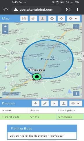 vesselandthereistheavailabilityoflivelocationanditalso hasafacilitythatstorestheprevioustracehistoryasshown in fig 15 and also helps to create the geo fences. The live location and tracking of the data can be accessed from a phoneorlaptop.Wegetthealertmessagewhenthereisin and out of the fishing vessel in the respective geofence as showninfig14.