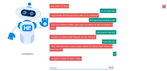 Onceyouhaveauthenticatedin,thechatbotgreetsyouand interactioniscommenced.Itwillaskyouabunchaquestion and then depending on your symptom it explicates the disease briefly, prescribes the medicine and whether to consult a medico or not. We had accentuated on the conceptionthatwewantedtoavailunletteredpeoplesoif theutilizerisinculcatedtoonlysomeextentthechatbothas texttoverbalizationfunctionwhichreadstheconversation totheutilizerforbetterunderstanding.Wehaveutilizedthe chatterbot package; it utilizes the verdant Bayesian algorithmtodetermineiftheinputverbalexpressionmeets a particularset ofcriteria thatwarranta replicationto be engenderedfromthatlogicadapter.Thechatbotfunctionsin multiple languages for people from different regions to utilizeit.GoogleAPIisutilized(gTTS)forthis.