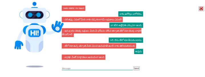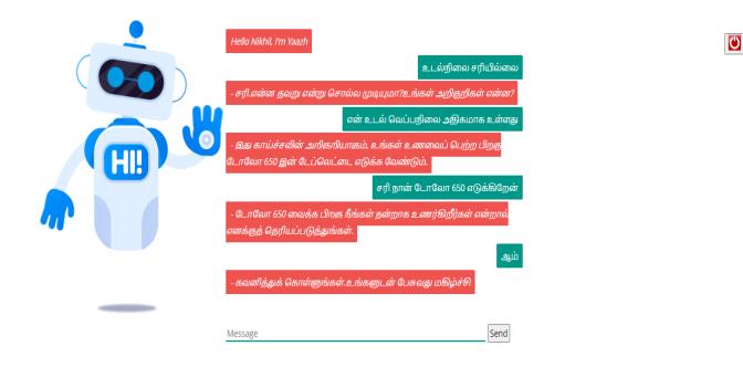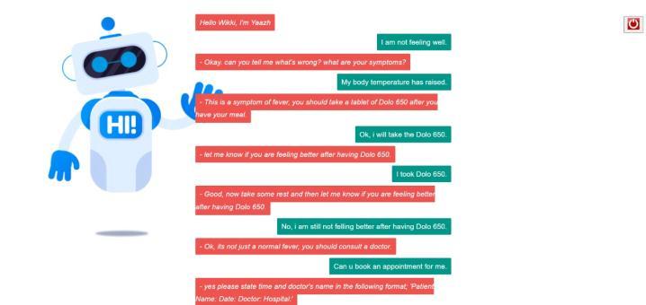 Toutilizethechatbottheutilizermusthaveacomputeror phonetoaccessit.Itisakintootherchatbotsinauthenticate in and the for incipient users, they have to engender an incipientaccountsotheirdetailsarestoredsafelywithusfor future references and it will be more facile for them to authenticate again ifcompulsory.After authenticate in the chatbotwillaskaseriesofquestionsfollowingwhichitcan providethefelicitousdiagnosis.Forthechatbotwehavenot used traditional datasets, we have inscribed .yml files and havethemindictedforthechatbotmanually.