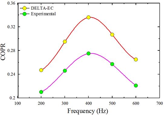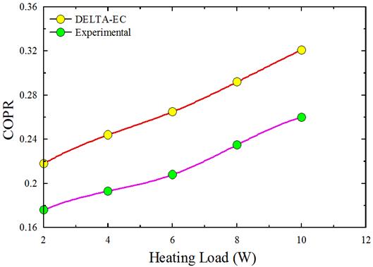 The COPR obtained was 0.275 and 0.336 for experimental and DELTA EC model with parallel platestack using heliumas the working substance corresponding to a 10W heating load at 400 Hz frequencyfor1.6%DRof10barmeanpressure.