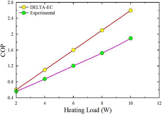 The COP obtained was 2.205 and 2.598 for experimental and DELTA EC model with parallel platestack using heliumas the working substance corresponding to a 10W heating load at 400 Hz frequencyfor1.6%DRof10barmeanpressure.