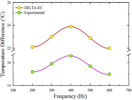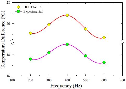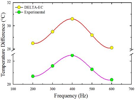 It was also found from both the experimental and DELTA EC results that the temperature difference increasesfrom200Hzto400Hzanddecreasesafter400 Hz due to the existence of sound energy which makes resonator to vibrate. The system will not be able to sustain because of higher input power of the loud speaker (acoustic driver). The viscous losses increase andthermoacousticeffectdecreasesduetotheexistence ofweakthermalpenetrationdepthinthestackathigher operatingfrequencies.