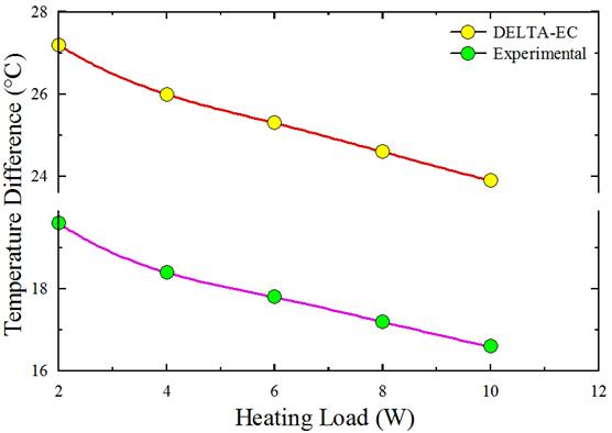 The magnitude of the temperature difference between the hot end and cold end of the parallel plate stack was found 30.6oC for DELTA EC model compared to experimental results of 22.5oC at 2 watts heating load, 400 Hz frequency and 2% DR corresponding to a pressureof10bar.