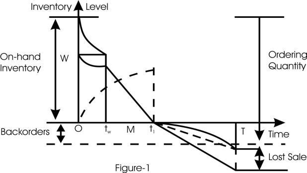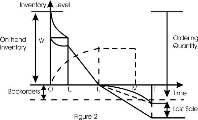 whichshowsthatt1 isafunctionoftw Furthermore, at time t1, the inventory level reaches zero in OW and lack happens. During [t1, T], the inventory level solely depend upon demand, and a few demand is lost whereas a fraction 1 1Tt of the demand is backlogged, where t [t1, T]. The inventory levelisgovernedbythefollowingdifferentialequation: