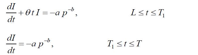 anddeteriorationanditbecomeszeroatt,T1.Throughout the shortage interval [T1,T ] the demand is unhappy. The instant inventorylevel atany time tinL, Tis given by the subsequentdifferentialequations: