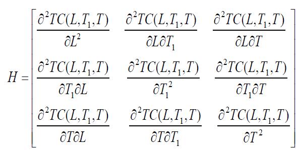 Onsolvingtheseequations,wefindtheoptimumvaluesofL, T1 and T for which the total variable inventory cost is minimum The sufficient conditions for TC(L,T1,T ) to be minimumarethattheprincipalminorsofHessianmatrixor Hmatrixarepositivedefinite.TheHessianmatrixisdefined asfollows:
