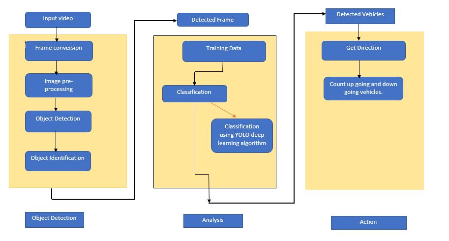 Inthisproject,wewilldetectandclassifythecarsmovingontheroadandalsocountsthenumberofcarspassingthrough theroad.Weneedtocreatetwoprogramsforthisproject.ThefirstonewilltrackthecarsusingOpenCV.Itkeepstrackof each and every detected vehicle on the road and another one will be the main detection program. The prerequisites required for working with these projects are python 3.0, OpenCV 4.4.0, Numpy, and YOLOV3 pre trained model weights andconfigFiles.