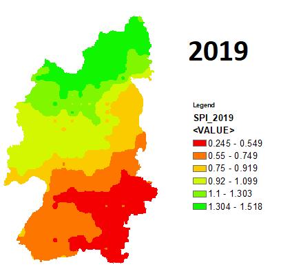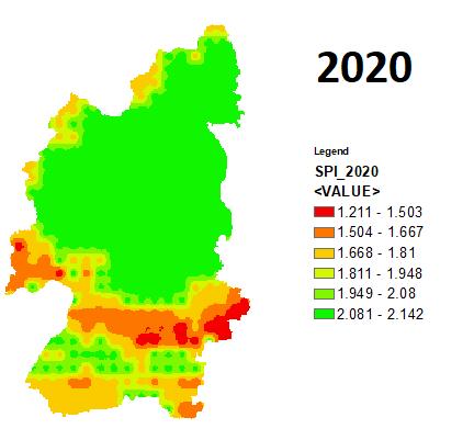 As a drought indicator, the SPI is calculated using the probability of precipitation for each given time scale. A gamma probability density function is fitted to a given frequency distribution of precipitation totals for a certain station.UsingtheSPItool,a1 monthSPIwascomputedfor 10 years (2011 to 2011) from monthly rainfall data generatedfromCHIRPSdataproductstoexaminelong term monthly dry and wet conditions. Following that, using the IDWinterpolationapproachinArcGIS,aseasonalSPIraster (June September) was created for the period 2011 2021 based on 1 month SPI rasters for further study with vegetation indices produced from time series satellite