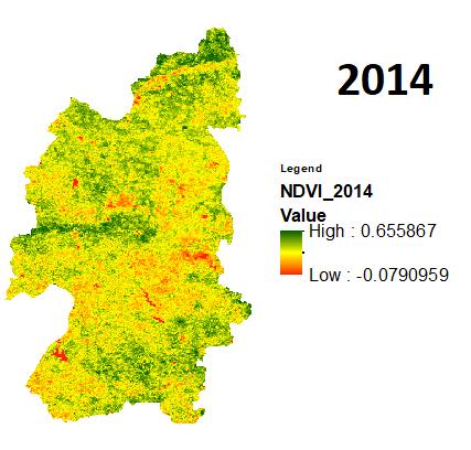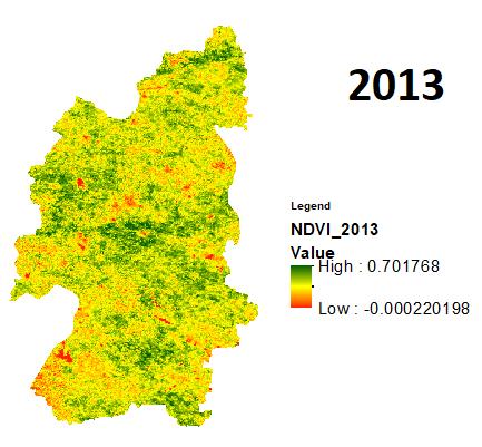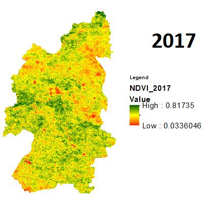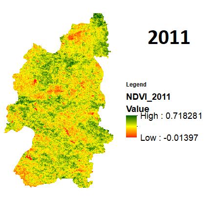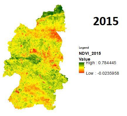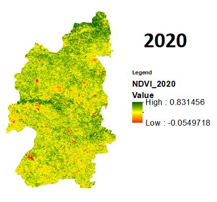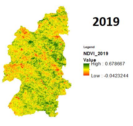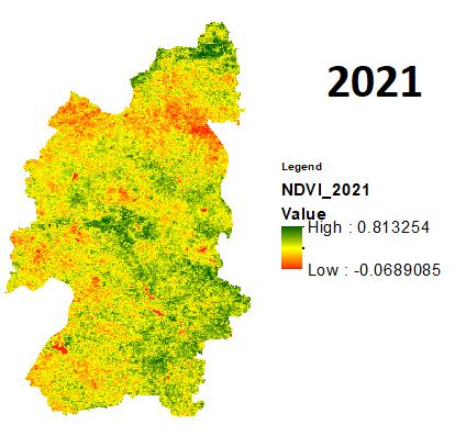 Onceagainrecentlyintheyear2021theduethedeficitin rainfall during the monsoon with a minimum SPI of 1.09 andtheeffectofsamewasobservedonthevegetationwith the min NDVI of 0.06. The year of 2011,2017,2018 even though received lower rainfalls as compared to normal rainfall of the district but received better rainfall than the previousdiscussedyearswiththerespectiveSPIindicesas 0.28, 0.24, 0.30andNDVIsas 0.01,0.03,0.00.Intheyearsof 2012,2013,2019themonsoonwasgoodwhileintheyearof 2020 the district received the best rainfall of the decade producinganSPIvalueof1.20.