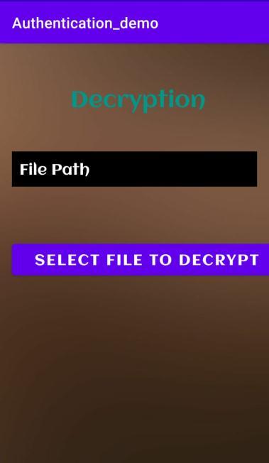 Decryption: Aftertheuserencryptsafile,ifthefile is to be decrypted then the user should select the required encrypted filefromthelist. AESalgorithm will be applied to the selectedfile and decryption takes place. The decrypted file will be stored in the internalstoragewith.txtextension.