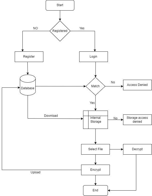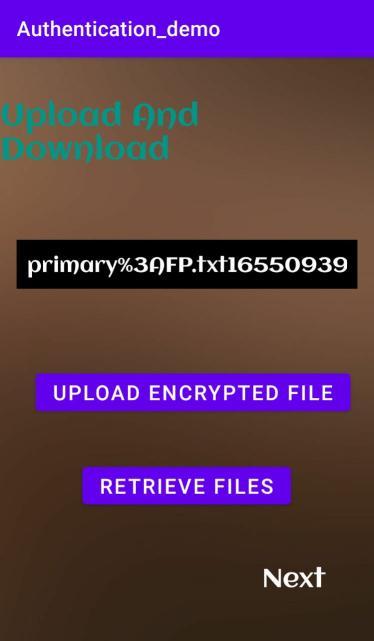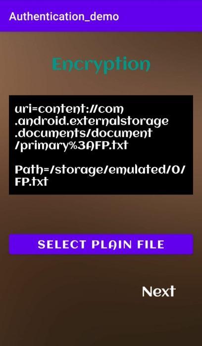 Encryption: After login, the user has to select the doc file to be encrypted. If the field is leftemptyan appropriatemessageisdisplayedtotheuser.Storage permissions need to be grantedby the user before selectingafilefrominternalstorage.AESalgorithm willbeappliedto selectedfileandencryptiontakes place. The encrypted file will be stored in the internalstoragewith.txtextension.