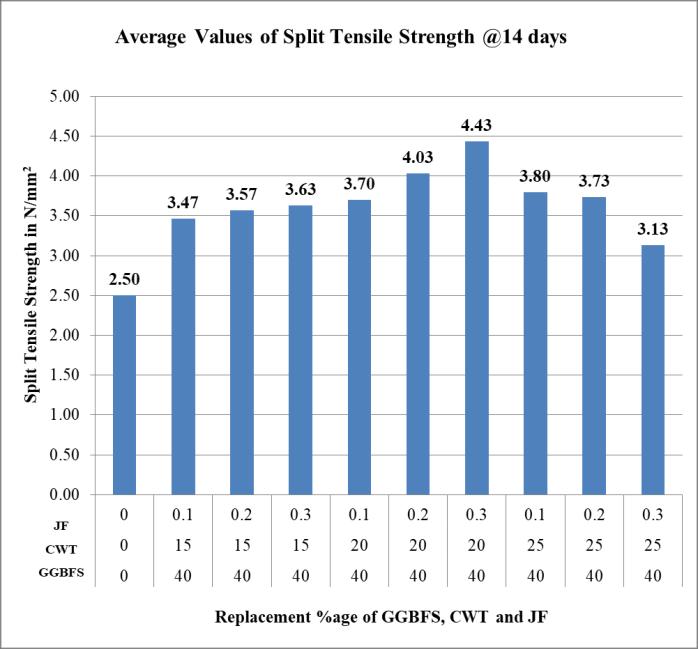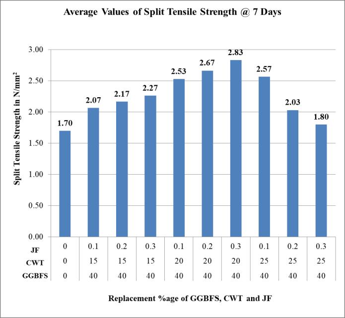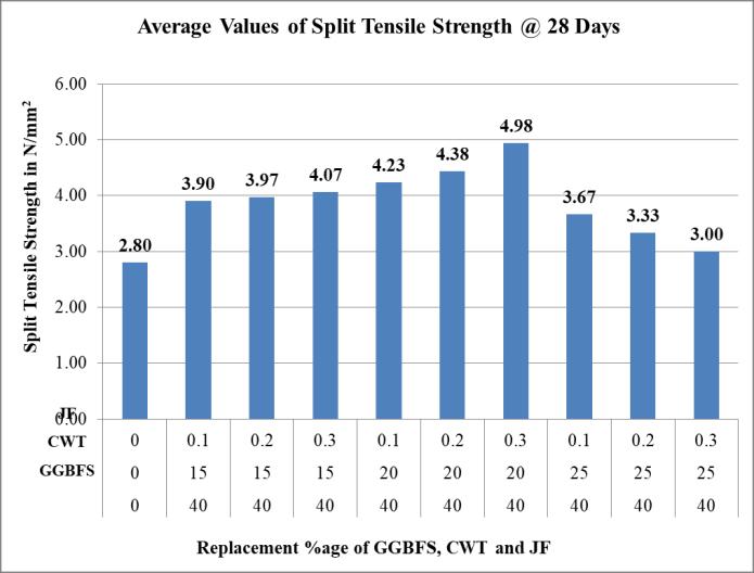 2. The Split Tensile Strength of concrete mix achieves maximumvalueof2.83N/mm2,4.43N/mm2and4.98 N/mm2 when GGBFS is 40%, CWT is 20% and Jute Fiberis0.3%.isaddedtoconcretemixafter7,14and 28daysofcuring,respectively.