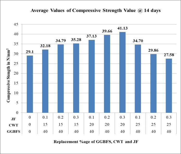 Figure 4.3: Compressive Strength of Concrete mix using GGBFS, Ceramic Waste Tiles and Jute Fiber after 14 days of curing.
