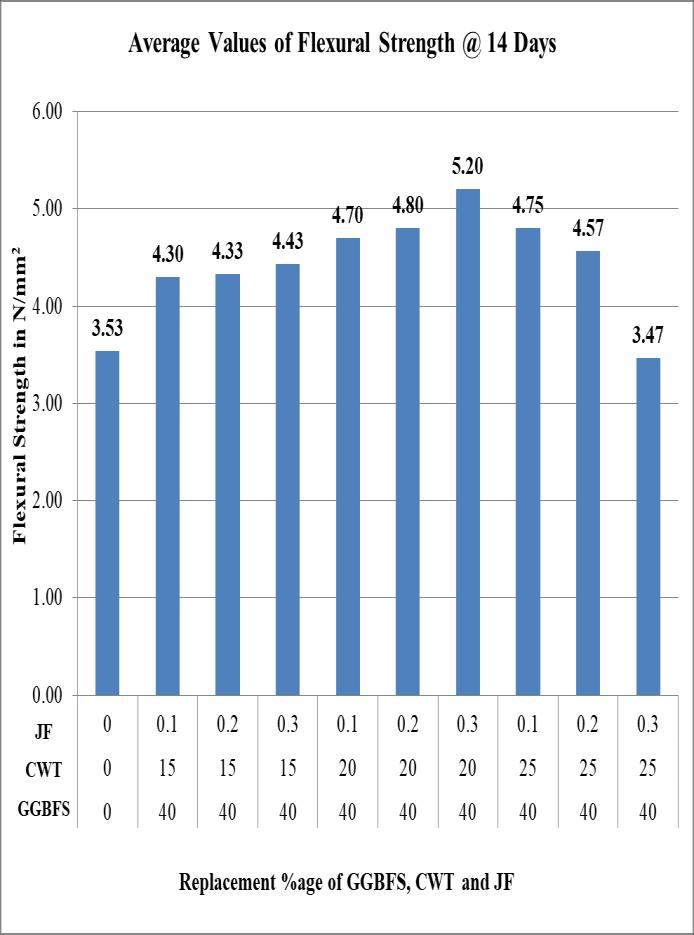 Figure 4.9: Flexural Strength of Concrete mix using GGBFS, Ceramic Waste Tiles and Jute Fiber after 14 days of curing.