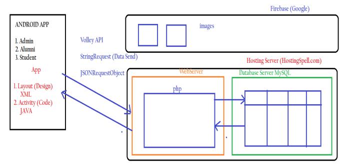 Ourproposedsystemisanandroid basedappwhichcanbe acquiredbyalumni’sandotherexistingstudentsbymeans ofinternet.Itenableseasyandfastcommunicationbetween adminsandusers.Eachuserwillhavetoupdatetheirown profiles. Admins and alumni can organize events and find jobs in different sectors in placement section. It also providessecurityauthenticationforeveryuser.