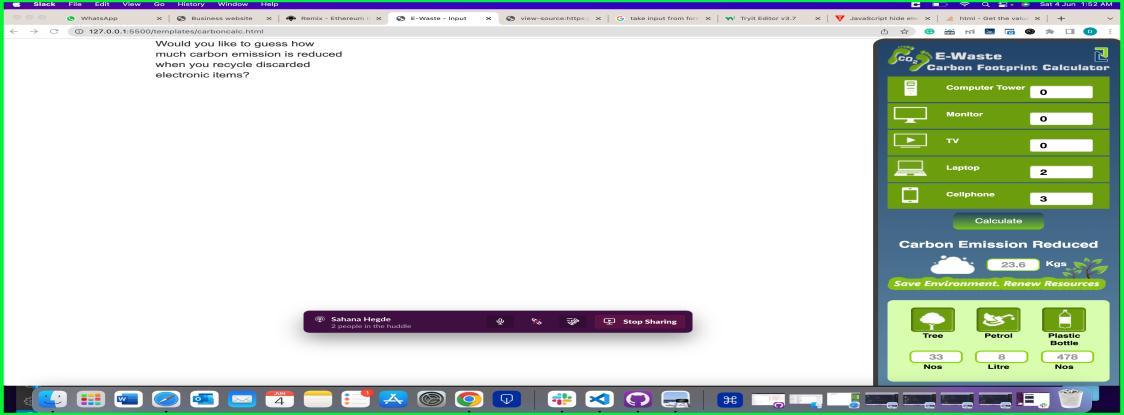 systems that duplicates and distributes a digital log of transactions across the network. A combination of these technologieshelpourusertobegrantedwithrewardpoints for successfully being a holder in the chain and who is contributing in their own ways to reduce co2 Emission to minimalamountandhelpusachieveNetzerotarget.Being involved in the development of Carbon calculators, this project is of great interest to environmental assessment professionalsandengineerslookingtodevelopstandardized tools for assessing the environmental impact of various humanactivities
