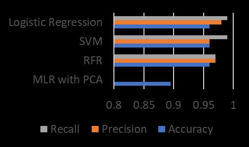 As demonstrated in the previous section. The logistic regressionmodelgavethebestresults,followedbySVMand RFR,thenMLRwithPCA.