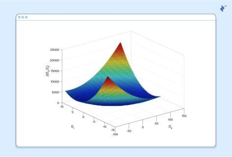 Herewecanseethecostassociatedwithdifferentvalues of and .Wecanseethegraphhasaslightbowltoits shape.Thebottomofthebowlrepresentsthelowestcost our predictor can give us based on the given training data.Thegoalisto“rolldownthehill”,andfind and correspondingtothispoint.